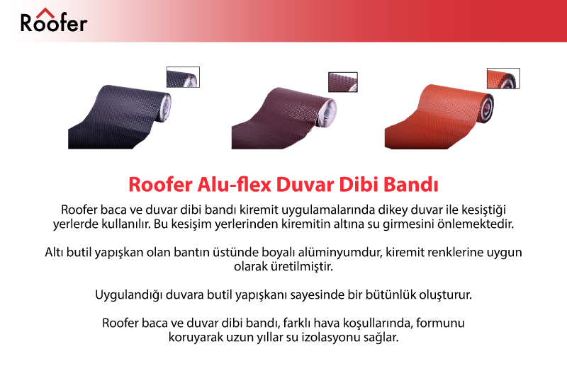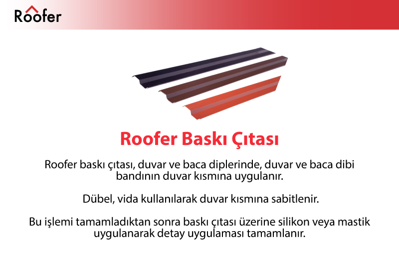 Roofer Duvar ve Roofer Baca Dibi Bantlarının uygulamasını yaparken duvar ve kiremite 15’şer cm bindirilecek şekilde yapıştırılarak uygulama yapılmalıdır ve detay, baskı çıtası ve slikon uygulanarak tamamlanmalıdır.